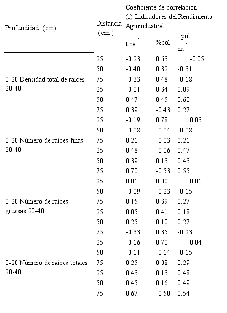Por otra parte, al relacionar el número de raíces finas también se presentó una correlación fuerte y significativa con la variable % pol en la profundidad 0-20 cm y distancia 25 cm. Estas raíces también mostraron correspondencia respecto a los tres indicadores del rendimiento agroindustrial en la profundidad 20-40, distancia lateral de 75 cm.