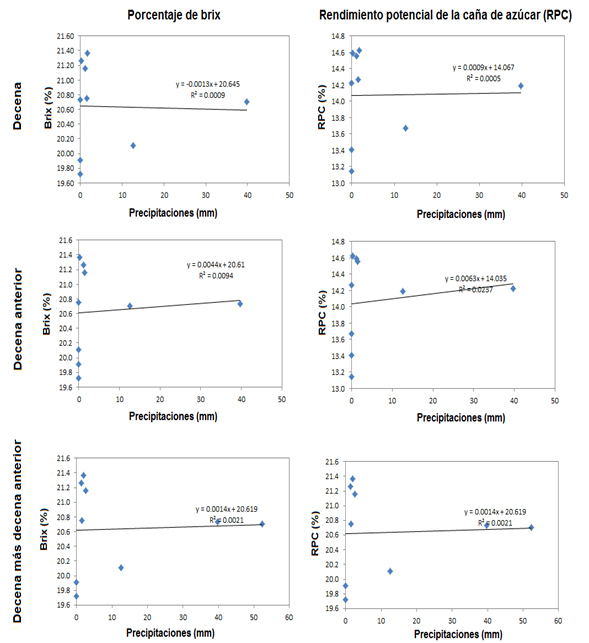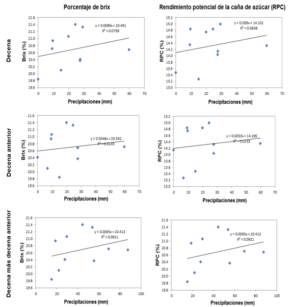 Al relacionar las precipitaciones de la decena de molida, precipitaciones de la decena anterior, más la suma de las precipitaciones ocurridas en las dos decenas anteriores a la molida de la caña (Figura 1), no se apreció efecto alguno sobre las variables de rendimiento industrial en la zafra 2013-2014. Los coeficientes de regresión estuvieron por debajo de 0.1, lo que evidencia la poca dependencia de unas variables sobre las otras, aún sobre el posible efecto acumulado de las lluvias sobre el rendimiento industr