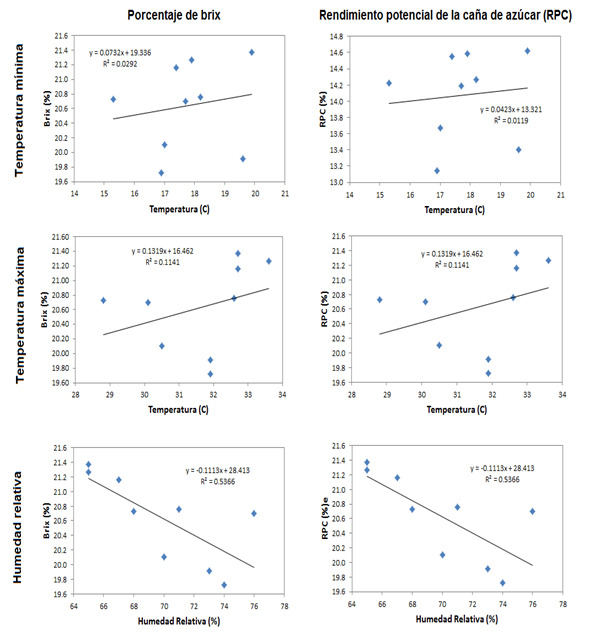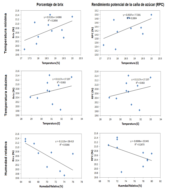 En la zafra 2014-2015 la temperatura mínima no presentó relación con las variables de rendimiento industrial (Figura 4). Sin embargo, se mantuvo la relación entre la humedad relativa y las variables de rendimiento industrial.