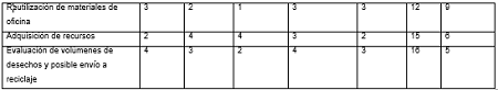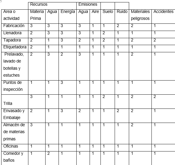 La valoración ambiental de las áreas y actividades de la organización se muestra en la Tabla 1.