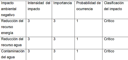De acuerdo con la importancia e intensidad del aspecto ambiental, los impactos pueden clasificarse como despreciable (2), moderado (entre 3 y 4), crítico (entre 5 y 6) y no aplicable, según la propuesta de la mencionada Guía para la implementación de la NC ISO 14001 (CITMA, 2000).