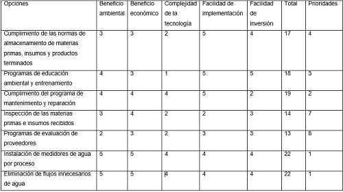 Para la selección de las opciones prioritarias se desarrolló una sesión de trabajo con el comité ambiental. En esta se evaluó para cada opción las siguientes variables: beneficio ambiental, beneficio económico, complejidad de la tecnología propuesta, facilidad para la inversión, facilidad de implementación; teniendo en cuenta los criterios, en una escala de 1 a 5, donde: