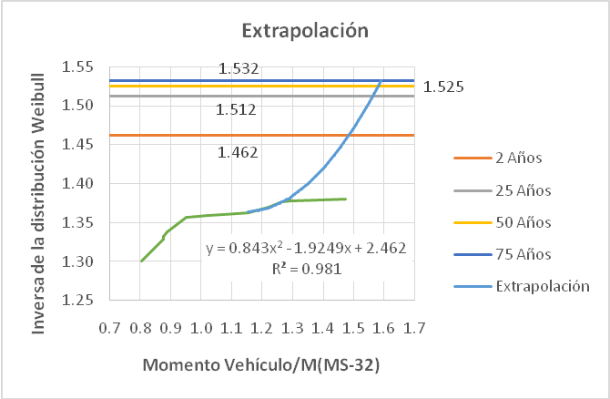Obtenido este valor, se realiza la extrapolación por el inverso del período de retorno, teniendo presente la vida útil del puente, según se muestra en la Fig. 4. En la misma, en el eje de las abscisas se representa la relación entre los momentos originados por los vehículos seleccionados y el ocasionado por el MS-32, mientras que en el eje de las ordenadas se representa la distribución inversa acumulada Weibull. La extrapolación se realiza mediante la prolongación de la cola hasta que corte las rectas que representan los períodos de retorno. Dicha prolongación se efectuó a través de una ecuación polinómica de grado 3, con un coeficiente de correlación R2 de 0.981, y obviando el último punto de la cola; pues, de considerarse, se obtendrían valores que representarían un aumento excesivo del peso de los vehículos. Estos irían más allá de su capacidad de carga real de los vehículos.