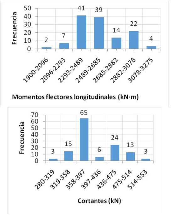 Las 130 secuencias arrojaron momentos flectores longitudinales y fuerzas cortantes, según se muestra en los siguientes histogramas de frecuencia.
