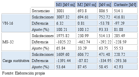 En la tabla 2 se realiza una comparación entre las solicitaciones que produce el modelo propuesto VH-16, las solicitaciones de la simulación, considerando el paso de varios vehículos para un 95 % de no excedencia, y los que ocasionan los vehículos normados.