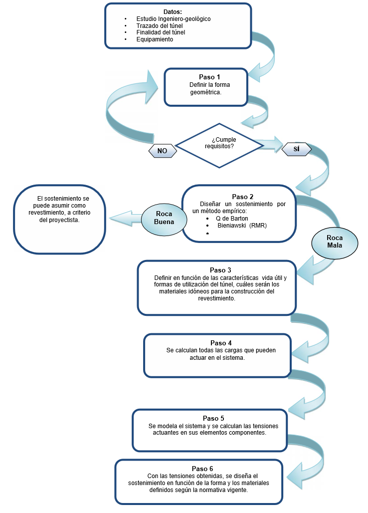 Se propone realizar el diseño geotécnico del túnel por el método del índice Q; esto brindaría el sostenimiento de la sección del túnel, útil en el proceso constructivo y para facilitar la construcción del revestimiento definitivo. A partir de esto se toman en función del macizo dos soluciones. En el caso de las rocas calificadas de buenas el revestimiento puede asumirse, y es bien visto en la bibliografía internacional, como el propio sostenimiento; siempre y cuando cumpla con todas las restantes características exigidas para el revestimiento. Para el caso de túneles a presión se deberá revisar el facturamiento hidráulico. En caso de sismo se comprobará la sección solo cuando las aceleraciones sean superiores a 0.2g (Conde, 2013).