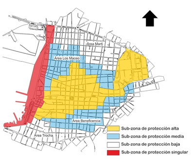 Tomando en consideración los anillos fundacionales y el área de altos valores arquitectónicos, se definió la zona para la Declaratoria del Patrimonio de la Humanidad, conjuntamente con los grados de protección que presentan sus edificaciones; de ahí que quedaran cuatro áreas bien definidas, que fueron tomadas en consideración para establecer las subzonas de protección: subzonas de protección alta, media, baja y singular (Ver figura 1).