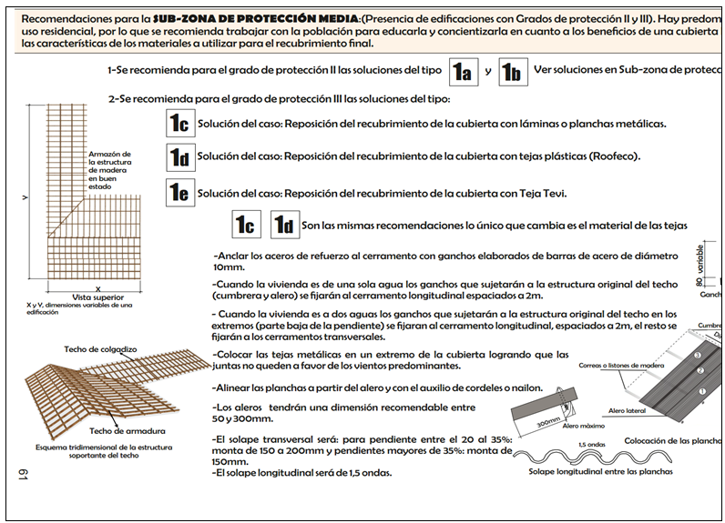 Para las recomendaciones específicas a nivel arquitectónico se tuvieron en cuenta las subzonas de protección declaradas en las Regulaciones Urbanísticas, los grados de protección, la forma de intervención, el tipo de cubierta (presencia de techo de armadura, colgadizo o mixtos), los recursos materiales y la mano de obra para la ejecución de las soluciones. Estas recomendaciones de diseño están enfocadas hacia la obtención de soluciones que permitan la seguridad de las cubiertas ligeras en edificaciones del Centro Histórico, de modo que eviten y reduzcan los desastres que puedan provocar los fenómenos naturales (viento y sismo) u otras acciones.