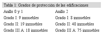 Dentro de los anillos fundacionales las edificaciones presentan grados de protección I, II y III A; en este contexto no existe el grado IV de protección. (Ver tabla 1).