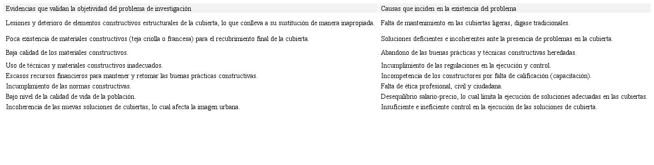 En la tabla 2 se muestran algunas de las evidencias y causas que inciden en el deterioro y pérdida de las cubiertas ligeras en el Centro Histórico, factores que provocan una imagen desfavorable en la configuración del paisaje.