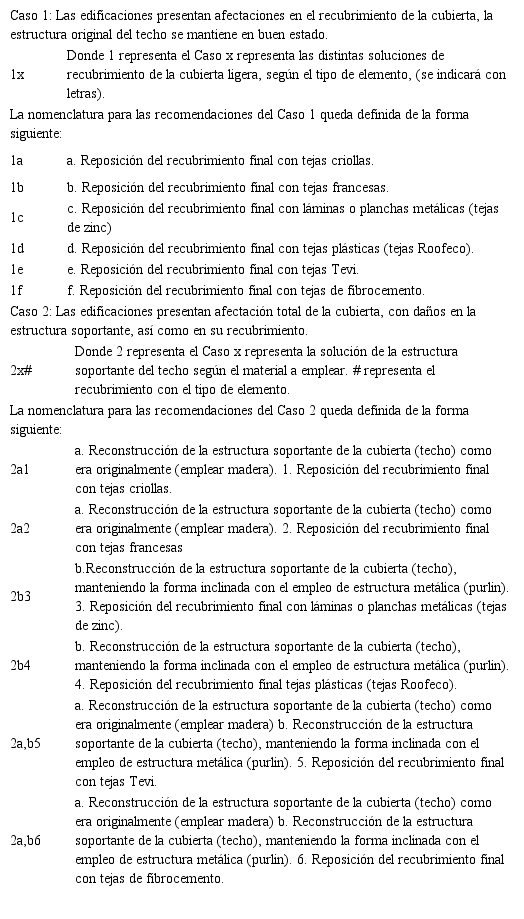 A continuación, se definen las recomendaciones de diseño para las cubiertas ligeras en edificaciones del Centro Histórico de Santiago de Cuba a partir de la nomenclatura definida: