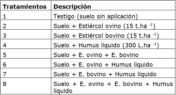Por otro lado, los mejores resultados reportados para el tratamiento combinado de los bioproductos ensayados (Suelo + Estiércol ovino + Estiércol bovino + Humus líquido) demuestran no solo las bondades de los residuos orgánicos, sino además un efecto potenciador de la actividad biofertilizante y bioestimulante del estiércol y el humus líquido al combinarlos de forma triple, en comparación con su aplicación doble, simple o sin aplicación alguna respectivamente (Rodríguez y Álvarez, 2002).