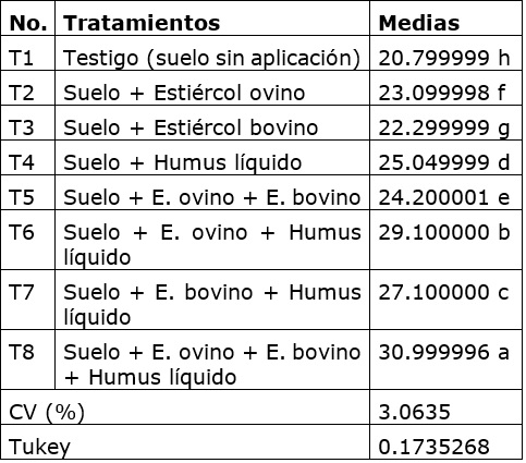 Para este indicador (tabla 5) se muestra el tratamiento T1 (testigo sin aplicación de bioproductos) con la menor media y el tratamiento T8 (Suelo + E. ovino + E. bovino + Humus líquido) con la mayor media; este último supera estadísticamente a todos los tratamientos ensayados.