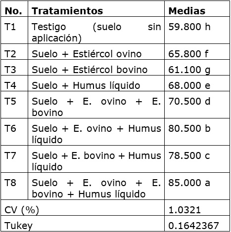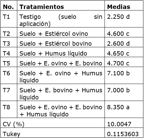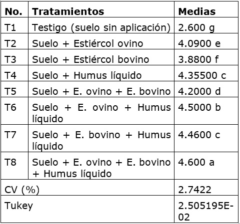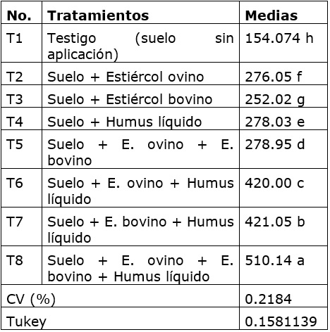 Este indicador (tabla 3) muestra el tratamiento T1 (testigo sin aplicación de bioproductos) con la menor media y el tratamiento T8 (Suelo + E. ovino + E. bovino + Humus líquido) con la mayor media; este último supera estadísticamente todos los tratamientos ensayados.