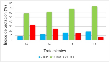 La Figura 1 muestra los resultados obtenidos en el índice de brotación de los posturas injertadas por tratamientos; como se observa, todos presentaron respuestas positivas a las alternativas nutricionales; se destaca el (T4), que alcanzó valores de un 73 %.