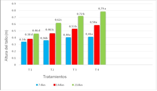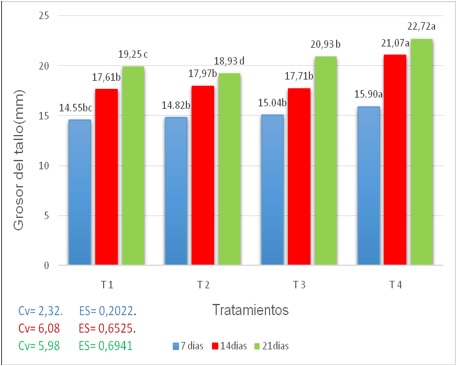 En la Figura 2 se muestran los resultados relacionados con la altura del tallo de las posturas injertadas. Todos los tratamientos presentaron un comportamiento variable, hay que destacar que en el primer momento los (T3) y (T4) no presentaron diferencia significativa entre ellos. Se observa que para el ciclo completo de crecimiento el (T4) mostró los mejores resultados con respecto al total de los tratamientos. Se destaca que la combinación de los dos productos presentó una sinergia en la estimulación en la absorción de solución nutritiva.