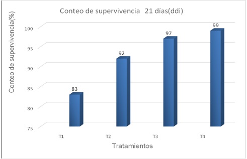 En la Figura 4 se representa el comportamiento de la supervivencia del injerto. Todos los tratamientos tuvieron un nivel de respuesta según las alternativas aplicadas, se destacan (T4) y (T3) con valores superiores al 95 %. Estos resultados son la respuesta a los buenos niveles de brotación y la conducción de las posturas injertadas.