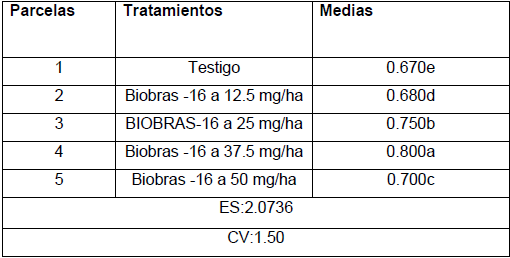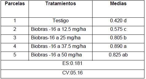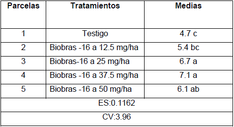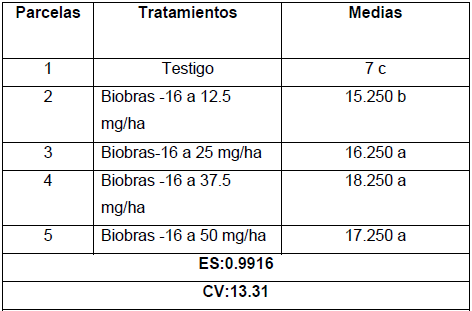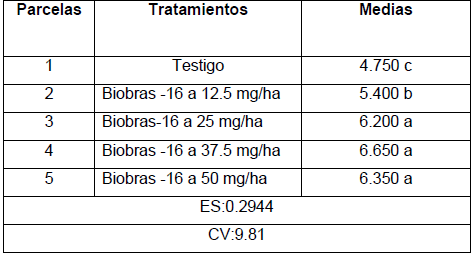 Al comparar las medias se pudo evaluar que en el tratamiento 4, donde se utilizó Biobras-16 a una dosis única de 37.5 mg/ha, se obtuvo una altura promedio del tallo de 18.250 cm, a pesar de no presentar diferencia significativa con el resto de los tratamientos con aplicación de bioestimulante (2 ,3 y 5), donde se alcanzó una altura promedio de 15.250, 16.250 y 17.250 respectivamente.