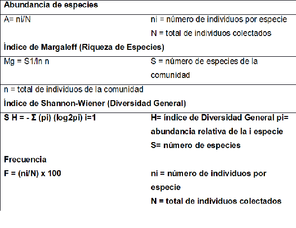 Una vez identificadas las diferentes especies se contabilizó la cantidad de ellas que pertenecía a una misma categoría taxonómica. Estos datos se utilizaron para los cálculos de los diferentes indicadores ecológicos evaluados. En la evaluación de los indicadores ecológicos se tuvieron en cuenta algunos índices propuestos por Mijail (2004) y Moreno (2006) para estudios de biodiversidad, así como los utilizados por Paula, De Faria, De Araújo & Schiavini (2010) y Cunha, Dos Gracas, Dos Reis, Macedo, Nascimento & Correo (2011) en estudios realizados sobre diversidad florística. Durante la investigación fueron evaluados los siguientes índices:
