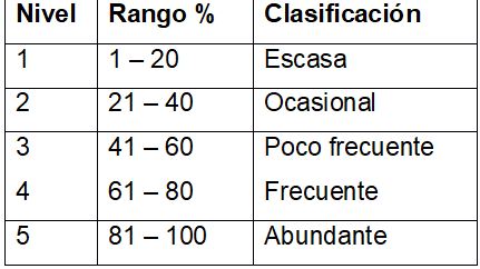 Las especies encontradas fueron clasificadas, además, según la frecuencia de aparición. Para ello se procedió de acuerdo con la escala utilizada por Vargas (2011), tal y como se muestra.