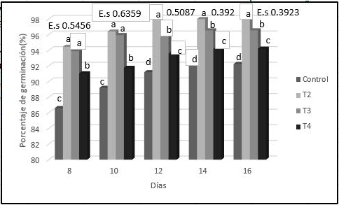 El porcentaje total de las semillas germinadas a los (10 días) fue significativamente superior en las unidades tratadas con el PectiMorf® y el biopreparado bacteriano. El PectiMorf® incrementó la germinación de las semillas de moringa en un 98 % y la bacteria B65 en un 96 % por encima del control y del tratamiento 4 (Figura 1). Las semillas tratadas con la mezcla de PectiMorf®+bacteria B65 (Tratamiento 4) no fue estadísticamente significativo con las no tratadas, en las cuales se observó la germinación total a los 14 y 16 días respectivamente (Figura 1).