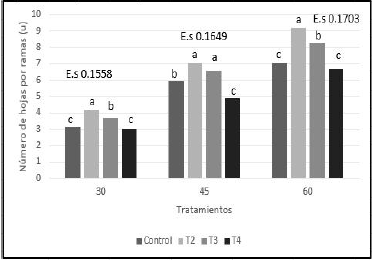 La aplicación de PectiMorf® mostró diferencias altamente significativas en los tres momentos de medición con respecto a los demás tratamientos. A los 30 días no se encontraron diferencias significativas en el número de hojas por ramas entre los tratamientos control y B65; el comportamiento fue similar a los 60 días, con una ligera diferencia a los 45 días. Las posturas procedentes de las semillas tratadas con la mezcla PectiMorf®-B65 en los tres momentos de evaluación obtuvieron los valores correspondientes al número de hojas por ramas inferiores a los demás tratamientos (Figura 2).