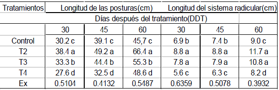 El enraizamiento también se vio favorecido con un incremento en la longitud radical en las plantas tratadas con la mezcla de oligogalacturónidos (PectiMorf®). Esta modificación se hizo evidente en los tres momentos de muestreo; no obstante, la diferencia fue mayor a los 60 días, por lo que la raíz de las posturas procedentes de las semillas tratadas con la mezcla oligogalacturónidos resultó ser mayor, como se puede apreciar en la (Tabla 1). El largo de la raíz difirió entre las plantas tratadas y el control en las tres evaluaciones, pues se exhibió una tendencia al incremento con la aplicación del PectiMorf® y B65 por separado en el tiempo; sin embargo, no mostró diferencias significativas respecto a las semillas tratadas con la bacteria B65 a los 30 días, siendo todo lo contrario a los 45 y 60 días (Tabla 1). También se evidenció el efecto negativo de la mezcla PectiMorf®+B65 sobre la longitud radical.