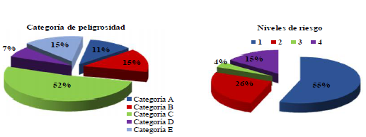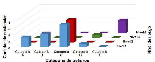 En el proceso de categorización de la peligrosidad de las sustancias correspondiente a la primera fase del método aplicado, en la figura 1 puede observarse que aparece reflejado: la cantidad de sustancias, sus categorías de peligrosidad según el método y su nivel de riesgo.