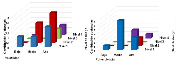 En la figura 2 se expone una relación entre la cantidad de sustancias líquidas, la volatilidad de las mismas y los niveles de riesgo en los que se ubican. Los productos en estado líquido con los que se trabaja en el laboratorio tienen una volatilidad alta y se ubican mayormente en un nivel de riesgo 2. Con respecto a la pulverulencia, la cual caracteriza a los productos en estado sólido, la figura 2 muestra una relación de estos con los niveles de riesgo. La pulverulencia en estos productos es media y se ubica en el nivel 1.