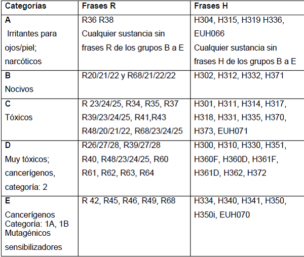 Peligrosidad intrínseca: clasificada en cinco categorías: A, B, C, D y E; de menor a mayor peligrosidad, en función de sus frases R o frases H.