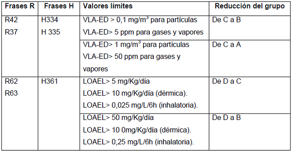 Algunas frases H: siempre que no haya otras frases H de mayor categoría se pueden plantear las reducciones de los grados de peligrosidad, según los valores límites en vigor establecidos para esa sustancia. En la tabla 2 aparecen las frases H para las que se puede reducir el grupo de peligrosidad en función de dos parámetros: el valor límite ambiental de exposición diaria (VLA-ED), que puede encontrase en las guías de límites de exposición profesional para agentes químicos en España, publicadas cada año por el Instituto Nacional de Seguridad e Higiene en el Trabajo (INSHT), y el Lowest Observed Advers Effect Level (LOAEL), que es la mínima dosis de producto para la que se observa algún efecto adverso en la salud.