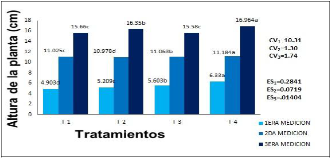 En la Figura 2, referente a la altura, en las dos primeras mediciones los tratamientos micorrizados poseen los mejores valores, excepto en la segunda medición, donde el T-1 supera estadísticamente al T-2.