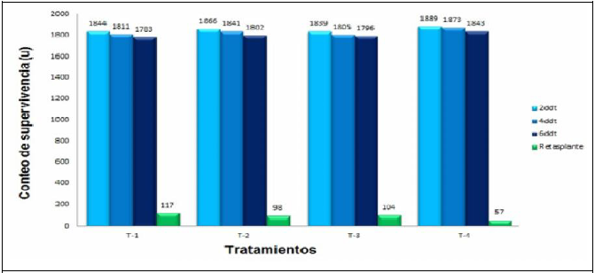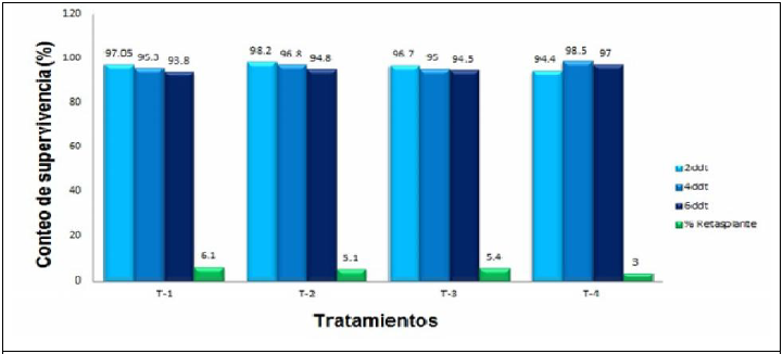 En la Figura 4 se demuestran los niveles en el conteo de supervivencia, expresados en %, los cuales fueron altos en un principio para todos los tratamientos. En la medida en que las posturas comienzan a establecerse en el medio natural son influenciadas por los factores climáticos y la biota del suelo.