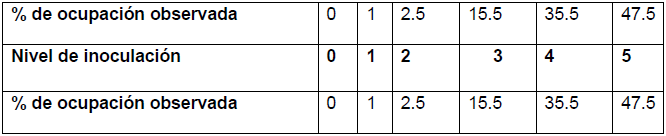 La determinación del porcentaje de densidad visual (% DV) se realizó por la metodología de Trouvelot, Kough, Gianinazzi-Pearson (1986), mediante la cual se evaluó la ocupación fúngica de cada intercepto y se le asigno un nivel. Posteriormente, se realizó el cálculo según la fórmula: