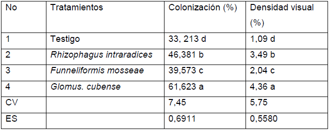 Los tratamientos inoculados incidieron en el crecimiento y desarrollo, se destacó Glomus cubense; además, mostro los mejores indicadores fúngicos, evaluados en el orden de 61,623 % de colonización y 4,36 % de densidad visual con respecto al resto.