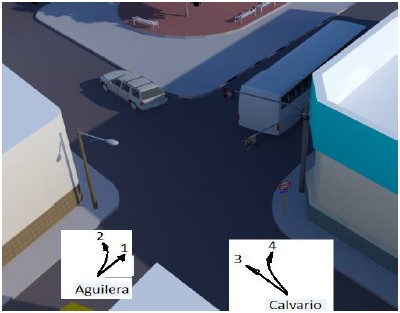 Se estudia el funcionamiento de la intersección a nivel Aguilera-Calvario (Figura 1) localizada en el casco histórico de Santiago de Cuba, a la que accede una parte importante del flujo vehicular que transita por el centro de la ciudad. La misma posee dos accesos de llegada, a saber: