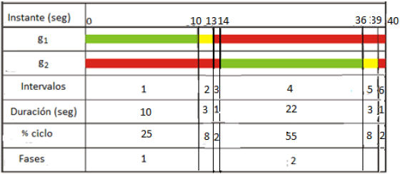Sobre la base de los volúmenes horarios equivalentes para el día de máxima demanda se pasa al cálculo del semáforo. Como resultado se propone el siguiente diagrama de fases (Figura 2).