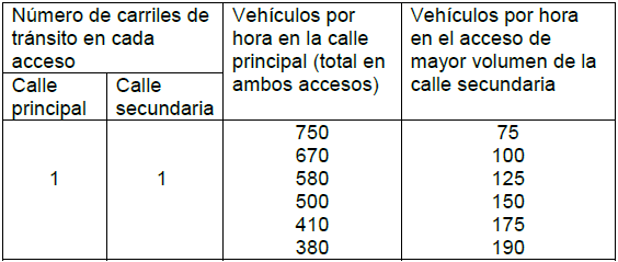 El criterio 1 constituye el factor más importante para determinar la necesidad de la instalación de un semáforo en régimen fijo, de ahí que se presentan los valores mínimos de vehículos equivalentes, establecidos para la situación en estudio: dos accesos de llegada cuyas secciones transversales poseen un solo carril (Tabla 1).