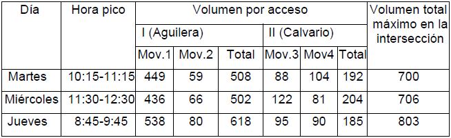 El primer criterio para la instalación de un semáforo exige del conocimiento del volumen medio de las 8 horas de mayor volumen en la intersección. Para el día de máxima demanda estos fueron los valores obtenidos: para la vía principal (Aguilera) 578 veh./h, para la vía secundaria (Calvario) 266 veh./h; superiores a los mínimos establecidos en la tabla 1 (500 veh./h y 150 veh/h respectivamente). Lo anterior indica que se justifica el cambio del semáforo en intermitencia a control en tiempo fijo. Los valores obtenidos el martes y el miércoles también sobrepasan los mínimos, lo que valida aún más la afirmación anterior.