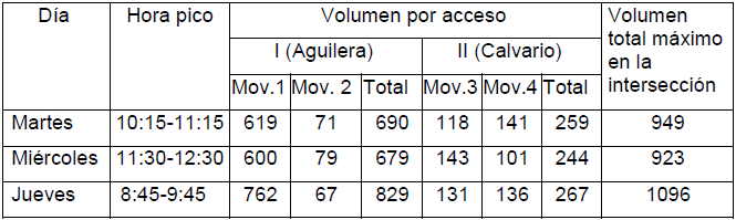 En la Tabla 3 se observa que el mayor valor de volumen mixto registrado fue 1096 veh/h en el horario comprendido entre las 8:45-9:45 am del jueves.
