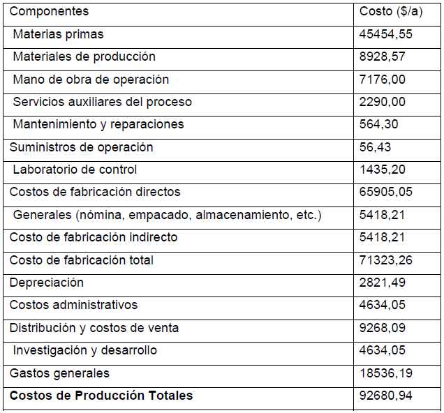 Los resultados del proceso de estimación del costo de producción, según el algoritmo presentado, son mostrados en la tabla 1.