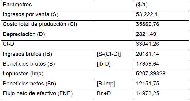 Se elaboró el flujo de caja para un periodo de trabajo de 10 años, considerando la tasa mínima aceptable del rendimiento (TMAR) del 15 % (Tabla 3).