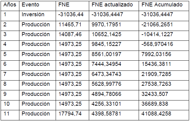En la tabla 2 se muestra la determinación del flujo neto efectivo para lo cual se empleó la ecuación