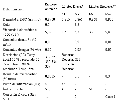 Como puede observarse, los resultados arrojados en las determinaciones de densidad y viscosidad son mayores que en el diesel, aunque cumple con lo especificado en la norma consultada en cuanto a las características del biodiesel, aspecto corroborado por la literatura (Sánchez y Huertas, 2012). Es necesario aclarar que los biocombustibles se utilizan formando mezclas con el diesel, con lo cual los valores de densidad y viscosidad pudieran ajustarse a lo especificado por las normas del diesel.