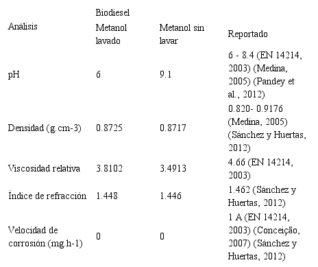 Los valores promedios obtenidos para estos dos productos se representan en la Tabla 1. También se representan los valores reportados para el biodiesel en estos análisis.