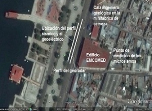 El área de estudio seleccionada para la validación es la del edificio de la Empresa Comercializadora y Distribuidoras de Medicamentos (EMCOMED), otrora Droguería Mestre y Espinosa, situada en la ciudad de Santiago de Cuba, frente al Paseo Alameda. En la Figura 1 se muestra la ubicación de este edificio, así como de las mediciones instrumentales y las calas ingeniero-geológicas llevadas a cabo.