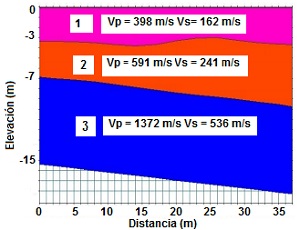 Mediante el método sísmico fue confeccionado un perfil con orientación suroeste-noreste, una longitud de 37 m y una profundidad de estudio de 7 a 10 m. En la Figura 2 se muestra el perfil sísmico realizado en áreas del edificio de EMCOMED, a partir de las primeras llegadas de las ondas; se obtuvo del software de análisis (Pickwin, 2011) la velocidad de las ondas longitudinales (Vp), que se dividen por capas o estratos en los primeros metros del subsuelo.