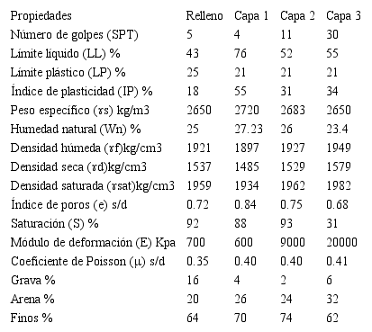 En la tabla 1 se muestran algunas de las propiedades físico-mecánicas del suelo a partir de los resultados de estas calas ingeniero-geológicas; las mismas serán utilizadas para evaluar diferentes fenómenos, tales como la licuación del suelo y la amplificación de la señal sísmica.