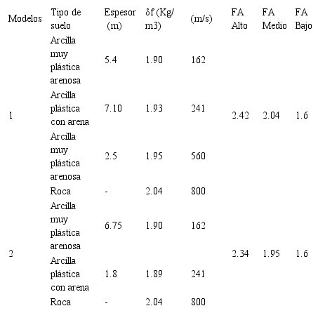 En la tabla 3 los parámetros del modelo 1 corresponden al informe de las investigaciones ingeniero-geológicas de 2015 y el 2 a las de 2014. Como la instalación de estudio pertenece a una obra ordinaria, de acuerdo con sus características ajustadas en la propuesta de norma, el factor de amplificación escogido fue medio. De manera que la señal será amplificada en el caso de ocurrir un terremoto local en el área.