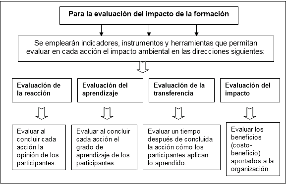 Evaluación del impacto y la eficacia de las acciones realizadas: para ello se establecieron indicadores que permiten evaluar el impacto y la eficacia de las diferentes acciones de formación y desarrollo en las temáticas ambientales que se ejecutan; asimismo, se realizarán evaluaciones sistemáticas de dichas acciones. En la figura 1 se explican las cuatro direcciones fundamentales hacia donde se orienta la evaluación del impacto.